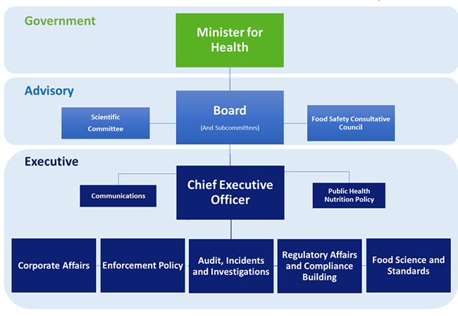 The FSAI comes under the aegis of the Minister for Health. It currently has an eight member Board, which is advised by the Scientific Committee and the Consultative Council. The Chief Executive is the direct link to the FSAI Board.