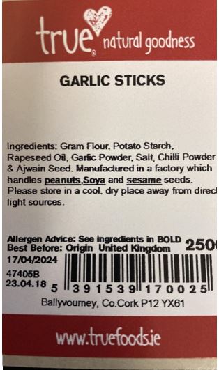 Peanuts, soya and sesame have been detected in the above batches of True Natural Goodness Garlic Sticks and are not declared in the list of ingredients. This may make the implicated batches unsafe for consumers who are allergic to or intolerant of peanuts, soya and / or sesame. The implicated product may also have been sold in shops labelled with the shop's own brand names; notices will be displayed at point-of-sale.