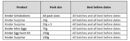 Further to FSAI Food Alert 2022.23, FSAI Food Alert 2022.23 (Update 1) and FSAI Food Alert (Update 2), Ferrero is extending the recall of Kinder products listed below to all best before dates. In addition, the recall includes all pack sizes of Kinder Schokobons. This is due to the possible presence of Salmonella. Point-of-sale recall notices will be displayed in stores supplied with the implicated batches.