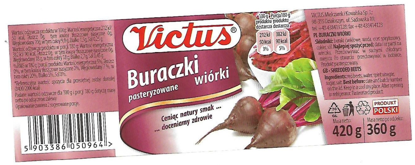 | Product Identification: | Victus Buraczki Pasteryzowane Wiorki (Shredded Beets), jar size: 420g |
