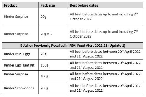 Further to FSAI Food Alert 2022.23 and FSAI Food Alert 2022.23 (Update 1) Ferrero is recalling additional batches of Kinder Surprise 20g and Kinder Surprise 20g x 3 listed in the table below, due to the possible presence of Salmonella.  Point-of-sale recall notices will be displayed in stores supplied with the implicated batches.