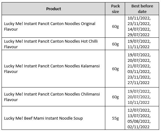 The batches of Lucky Me! Instant Noodles detailed in the table below are being recalled due to the presence of the unauthorised pesticide ethylene oxide. This pesticide is not authorised for use in foods sold in the EU. Although the consumption of the contaminated product does not pose an acute risk to health, there may be health issues if there is continued consumption of ethylene oxide over a long period of time. Therefore, exposure to this substance needs to be minimised. Point-of-sale recall notices will be displayed in stores supplied with the implicated batches.
