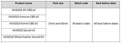 The Hugold CBD Oils listed below are being recalled as the products have been processed in an establishment where the activity has not been notified to the competent authority and is unregistered. The products listed below also contain concentrated CBD which is an unauthorised novel food.