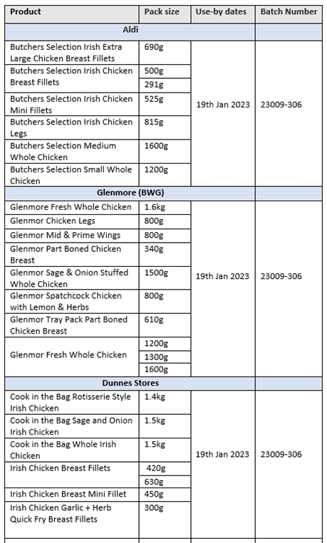 Recall of some batches of various raw chicken products due to the presence of Salmonella Typhimurium