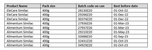 Abbott is recalling specific batches of its EleCare Similac and Alimentum Similac due to the possible presence of Salmonella and Cronobacter sakazakii. No products distributed to Ireland have tested positive for the presence of Cronobacter sakazakii or Salmonella Newport. Both products are foods used for special medical purposes for infants, ordinarily to be used under medical supervision. Point-of-sale recall notices will be displayed in stores supplied with the implicated batches.