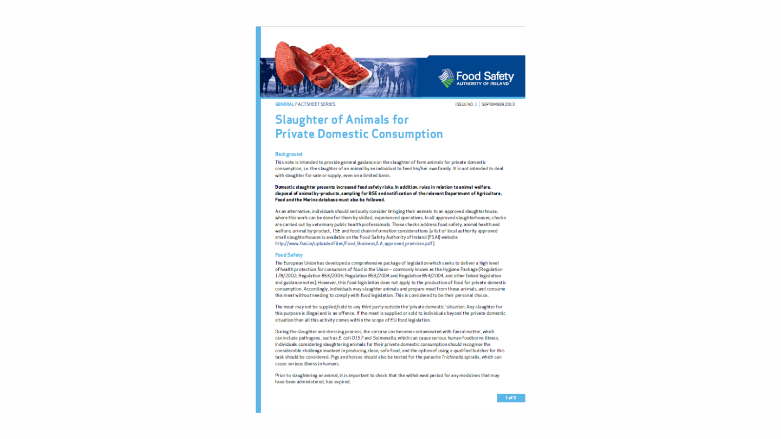 This factsheet provides general guidance on the slaughter of farm animals for private domestic consumption, i.e. the slaughter of an animal by an individual to feed his/her own family.